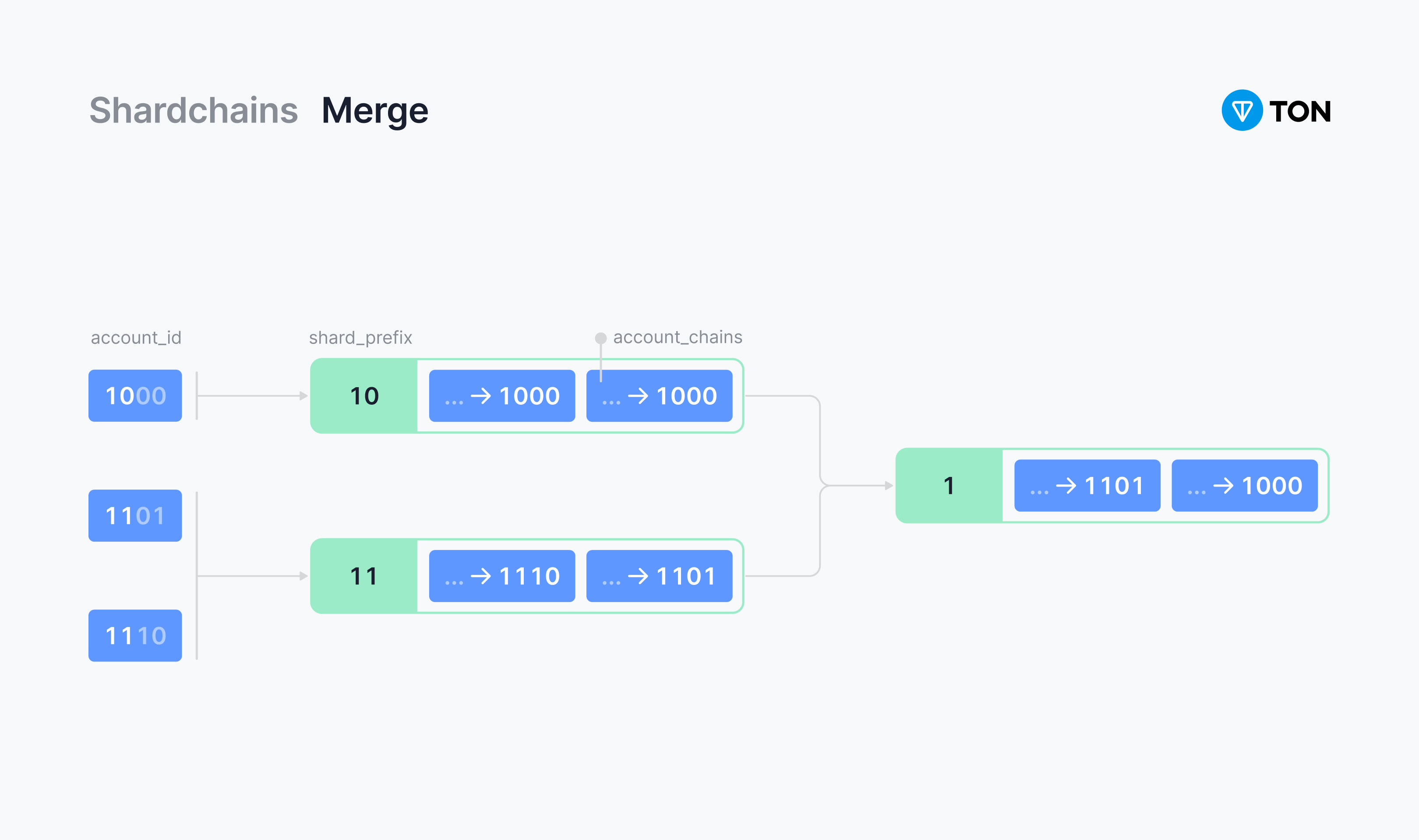 <parent prefix>010...和<父前缀110...。合并后的分片将拥有分片 ID<parent prefix>10...(例如10010...+10110...=1010...)。合并分片的第一个区块将具有seqno=max(seqno1, seqno2) + 1。