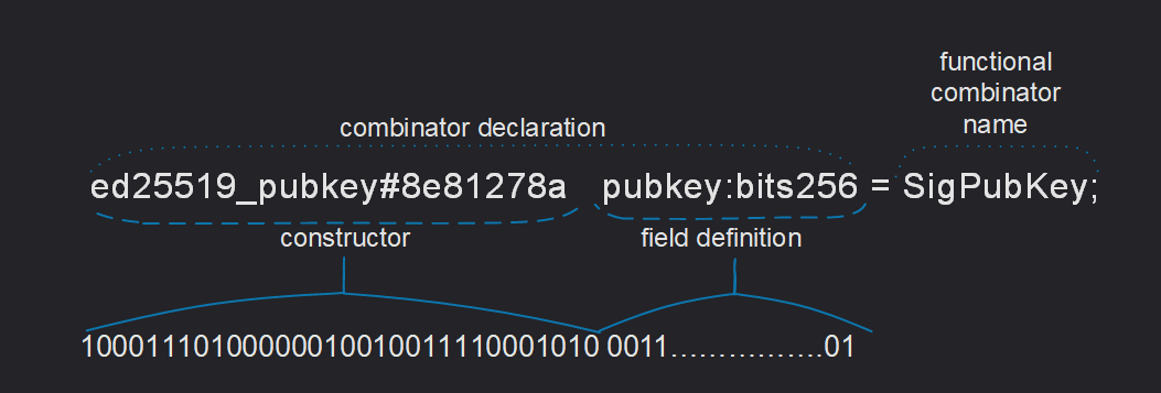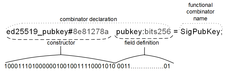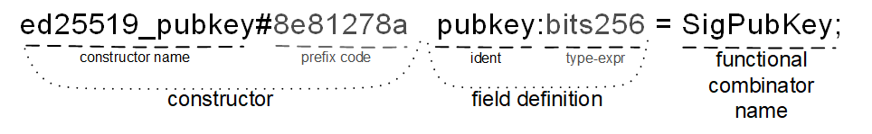 Note that every constructor name is immediately followed by an optional constructor tag, such as #_ or $10, which specifies the bitstring used to encode (serialize) the corresponding constructor.