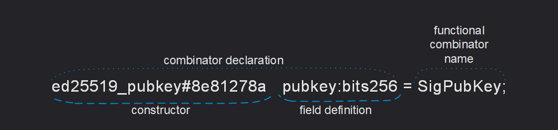 The left-hand side of each equation defines how to construct or serialize a value of the type specified on the right-hand side. It begins with the name of a constructor, such as a message or bool_true, followed by an optional constructor tag, such as #3f5476ca or $0, which specifies the bitstring used to encode (serialize) the constructor.
