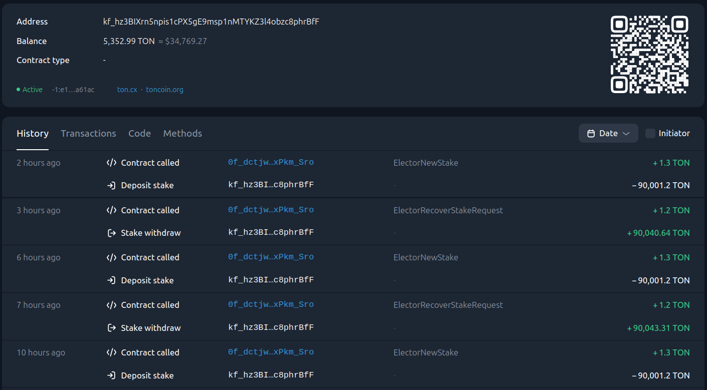 ADD STAKEbutton or scan the QR code using Tonkeeper or another TON wallet. - Enter the TON amount and send the transaction. The TON coins will then be added to staking.